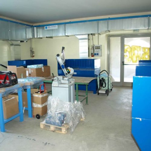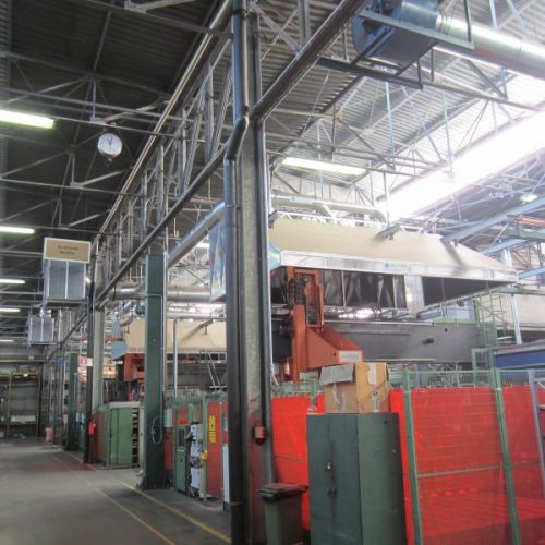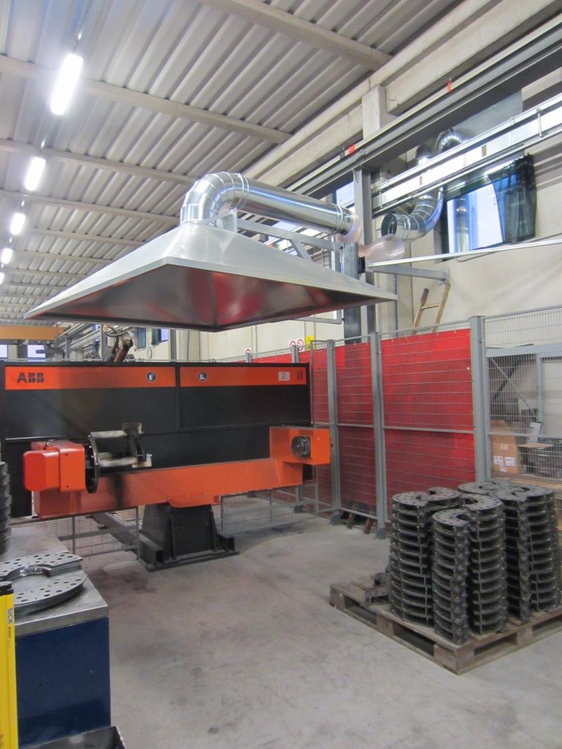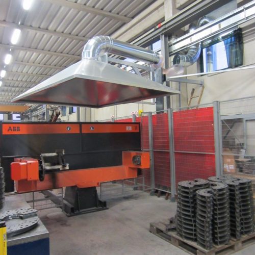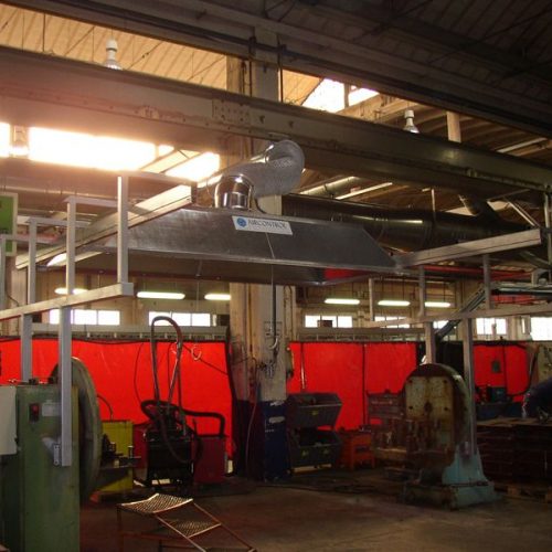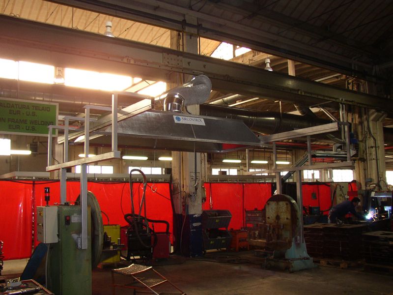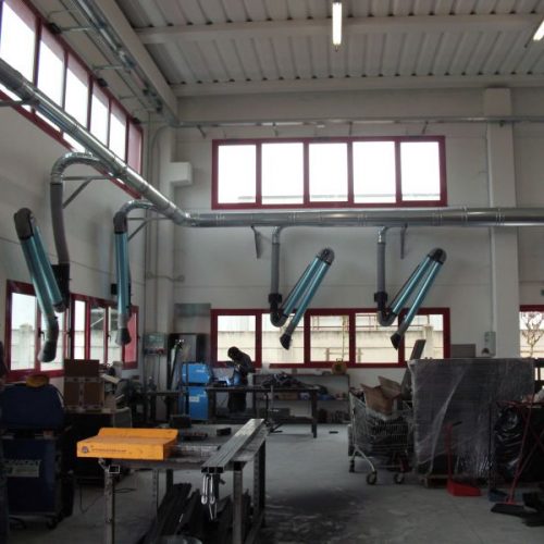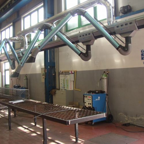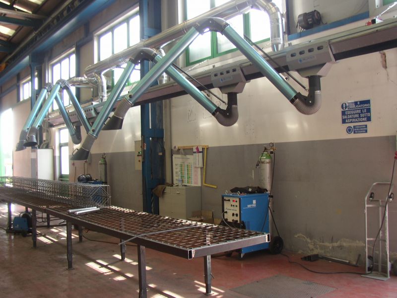 Impianti di aspirazione fumi di saldatura con bracci aspiranti snodati, cappe, bandiere rotanti, cappe per robot di saldatura, canaline aspiranti.