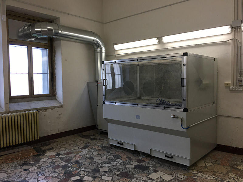 Banco aspirante compartimentato per settore militare con filtrazione assoluta per pulizia di apparecchi elettronici provenienti da zone di guerra.
