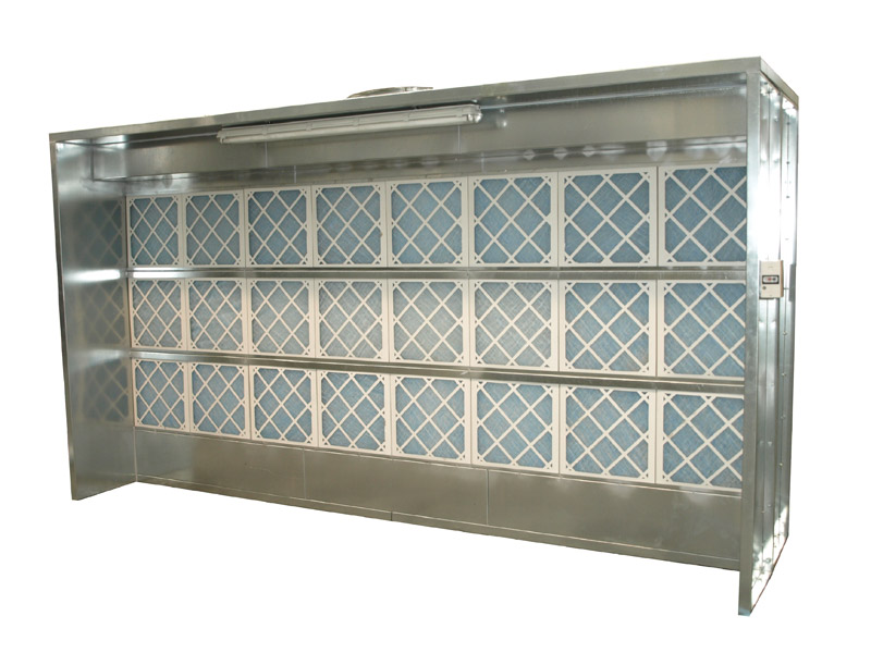 Cabina di verniciatura, versione ATEX 22 D, avente struttura portante in pannelli di lamiera zincata pressopiegata, completa di: